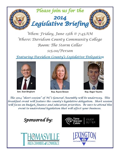 The 2014 "short session" of NC's General Assembly will be underway. This breakfast event will feature the county's legislative delegation. Short session will focus on budget, finance and education priorities. Be sure to attend this event to understand legislation that will affect your business.